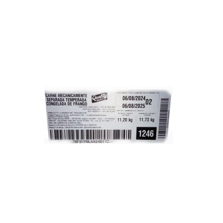 Carne mecánicamente separada de pollo , sal, glucosa, azúcar, estabilizante (tri polifosfato de sodio, INS 451i), saborizante (glutamato monosódico, INS 621), antioxidante (eritorbato de sodio, INS 316), aromas naturales (cebolla, ajo, humo y pimienta negra), conservadores (nitrito de sodio, INS 250; nitrato de sodio, INS 251) y colorante (carmín de cochinilla, INS 120).