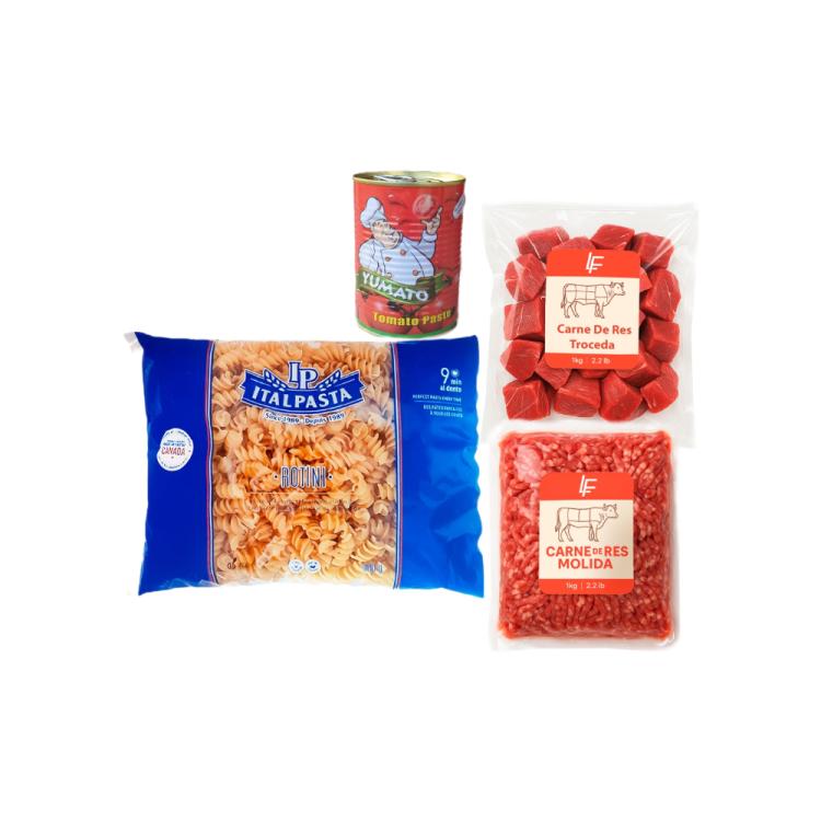 Carne de res troceada + Carne de res molida + Pasta de tomate + Pasta rotini