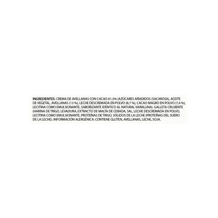 -Ingredientes: Crema de avellanas con cacao 81,5% (azúcares añadidos (sacarosa), aceite de vegetal, avellanas (13 %), leche descremada en polvo (8,7 %), cacao magro en polvo (7,4 %), lecitina como emulsionante, saborizante idéntico al natural vainillina). galleta crujiente (harina de trigo, levadura, extracto de malta de cebada, sal, leche descremada en polvo, lecitina como emulsionante, proteínas de trigo, sólidos de la leche (proteínas del suero de la leche). información alergénica: contiene gluten, avellanas, leche, soja.