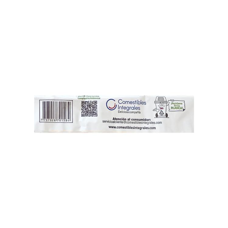 Ingredientes: harina de trigo fortificada (niacina 55 mg/kg, hierro 44 mg/kg, tiamina (vitamina B1) 6.0 mg/kg, riboflavina (vitamina B2) 4.0 mg/kg, ácido fólico 1.54 mg/kg, agua, grasa vegetal (palma, antioxidante (TBHQ/ buti-hidroxiquinona terciaria), emulsificante (lecitina de soya)), panela de caña de azúcar, sal regulador de acidez )bicarbonato de sodio y/o bicarbonato de potasio, leudante (levadura). Contiene trigo (gluten) y soya. Producto elaborado en una planta donde se fabrican productos con maní, almendras, ajonjolí, leche y huevo.