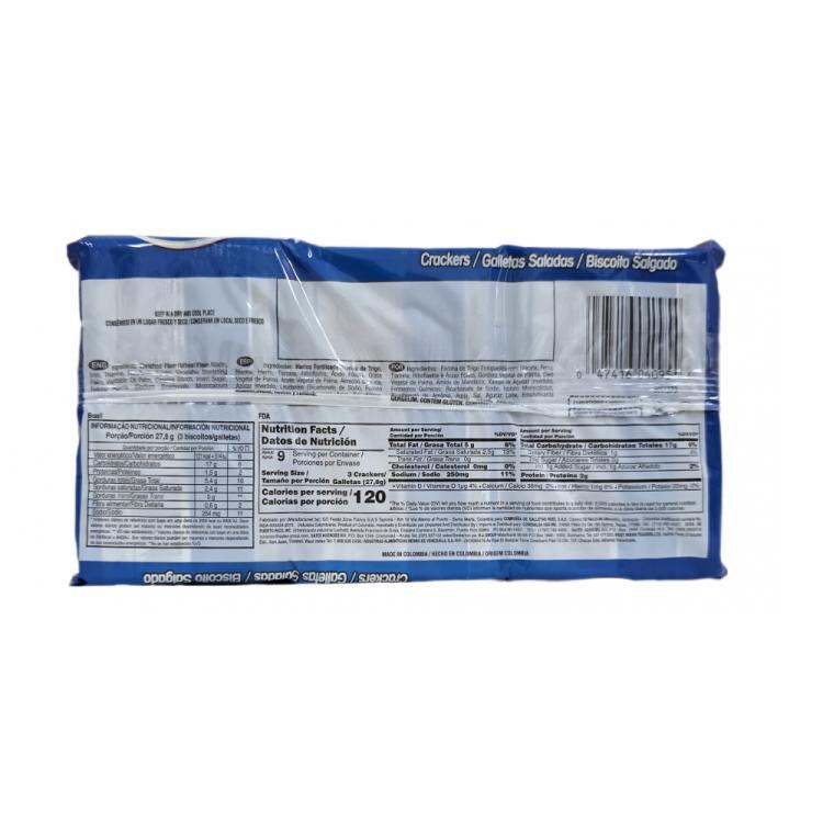 Ingredientes: Harina fortificada (harina de trigo, niacina, hierro, tiamina, riboflavina, ácido fólico), grasa vegetal de palma, aceite vegetal de palma, almidón de yuca, azúcar invertido, leudantes (bicarbonato de sodio, fosfato monocálcico, bicarbonato de amonio), agua, sal, azúcar, emulsificante (lecitina de soya), sabor artificial a mantequilla, leche. Contiene trigo (gluten), soya, leche y trazas de huevo, cebada, sésamo, avena, nueces y centeno.