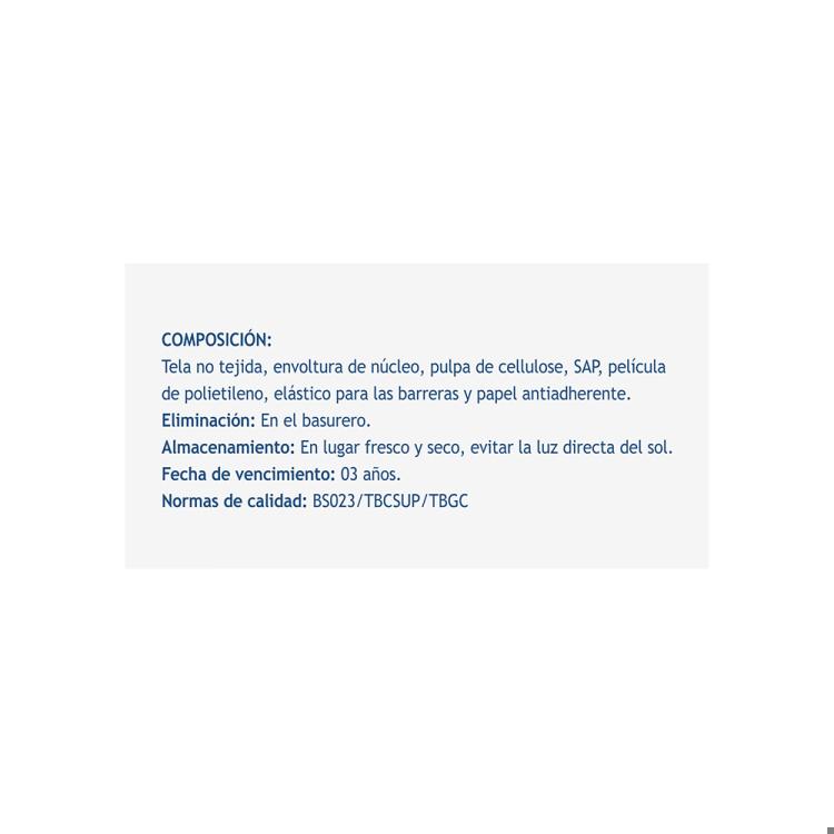 Composición: Tela no tejida, envoltura de núcleo, pulpa de celulosa, SAP, película de polietileno, elástico para las barreras y papel antiadherente.