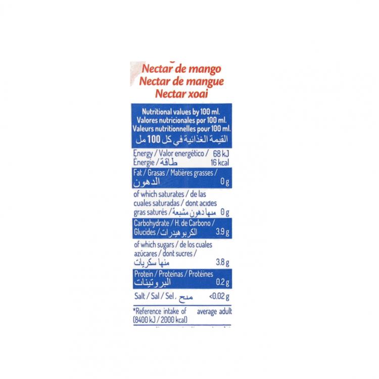 Ingredientes: agua, puré de mango a partir de concentrado, edulcorantes: sucralosa, acesulfame-k, acidulante, ácido cítrico, antioxidante, ácido L-ascórbico.
