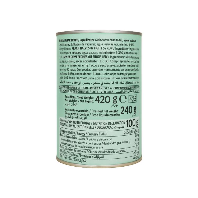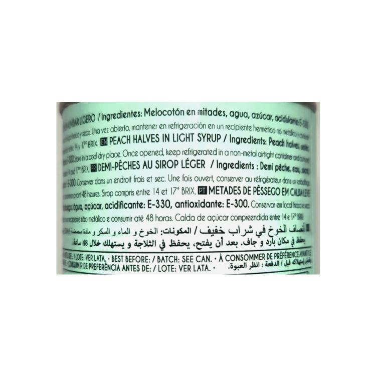 – Ingredientes: Melocotones, agua, azúcar, acidulante (E-330) y antioxidante (E-300).
