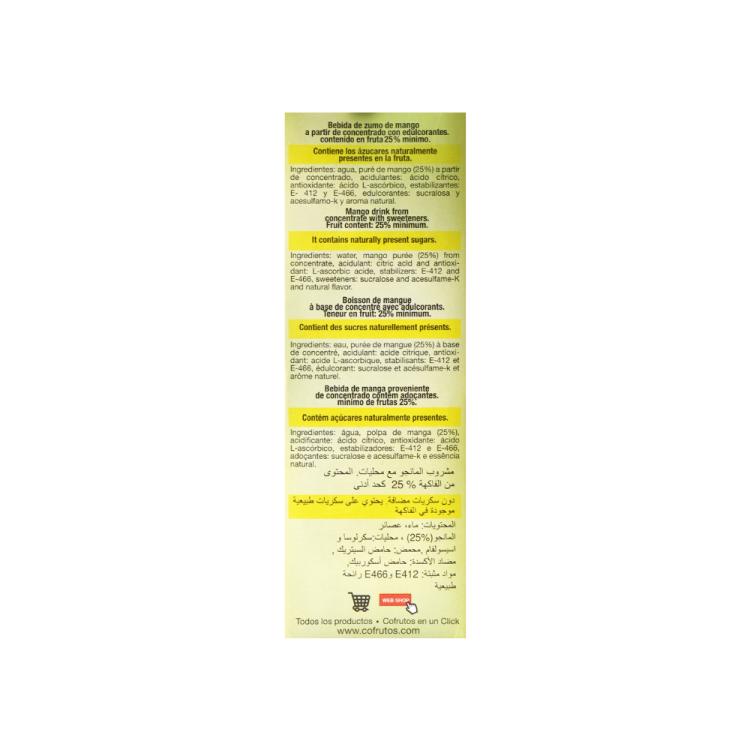 Ingredientes: agua, puré de mango ( 25 %) a partir de concentrado, acidulantes: ácido cítrico, antioxidante: ácido L-ascórbico, estabilizantes: E- 412 y E- 466, edulcorantes: sucralosa y acesulfamo- k y aroma natural.