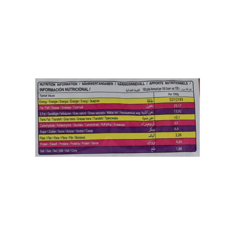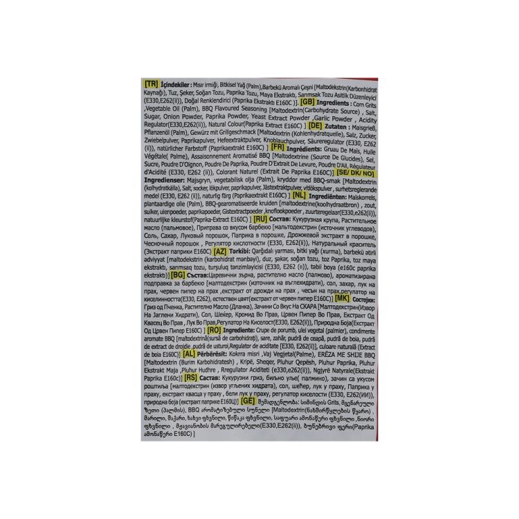 Ingredientes: sémola de maíz, aceite vegetal (condimento de pimienta pali a [maltodextrina (fuente de carbohidratos), sal, azúcar, cebolla en polvo, pimentón en polvo, regulador (E262(I), E330), tomate en polvo, pimiento rojo, extracto de levadura, antiaglomerante (E551), perejil, cloruro de potasio (E508), colorante natural (extracto de pimentón E160C), aromatizante (St), antioxidante (E306)).