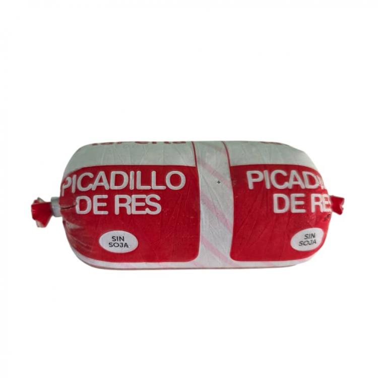 Picadillo de res sin soja, elaborado con carne de vacuno separada mecánicamente. Contiene agua, grasa vegetal, almidón, especias y aromas. Incluye conservadores y colorantes. Se recomienda cocinar completamente hasta alcanzar un mínimo de 75°C. Producto congelado a -18°C