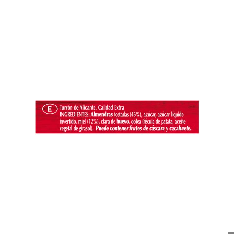 Ingredientes: Almendras tostadas (60%), azúcar, azúcar líquido invertido, miel (2%) clara de huevo, oblea (fécula de patata, aceite vegetal de girasol). Trazas de otros frutos de cáscara y cacahuetes. Conservar en lugar fresco, seco y alejado de olores. Temperatura ideal de conservación 18ºC – 20ºC.