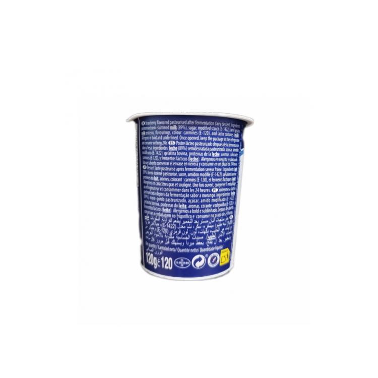 Ingredientes: Leche (89%) semidesnatada pasteurizada, azúcar, almidón modificado (E-1422), gelatina bovina, proteínas de la leche, aromas, colorantes: carotenos (E-160 a) y carmines (E-120), fermentos lácticos (leche).